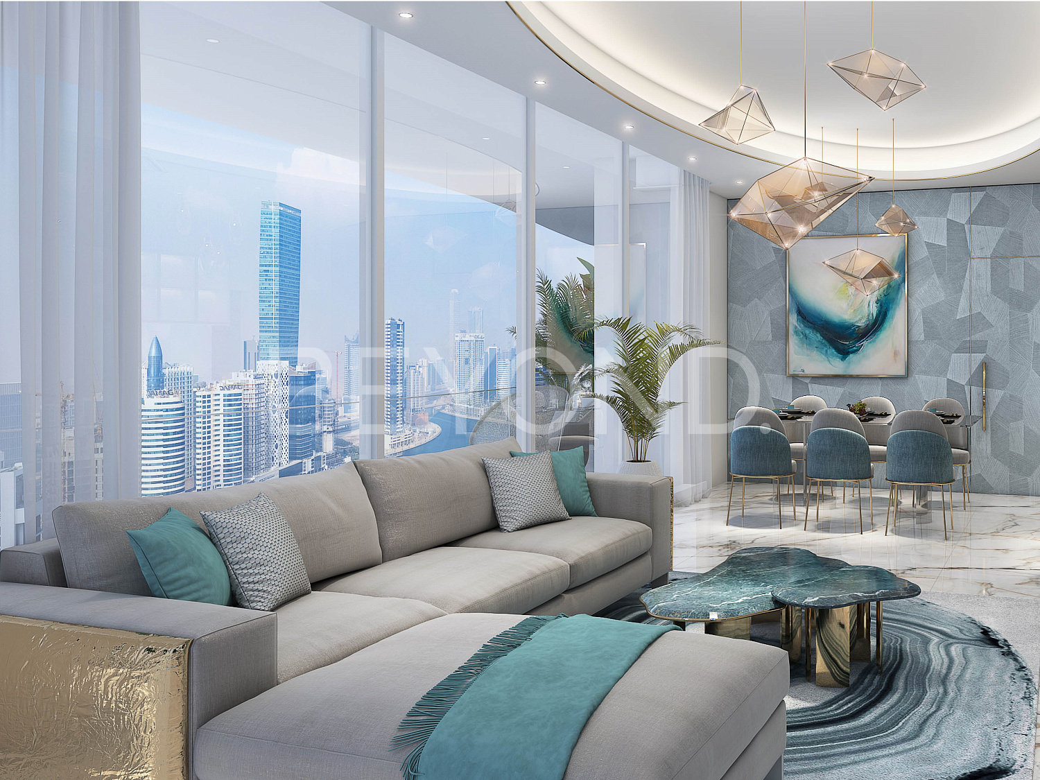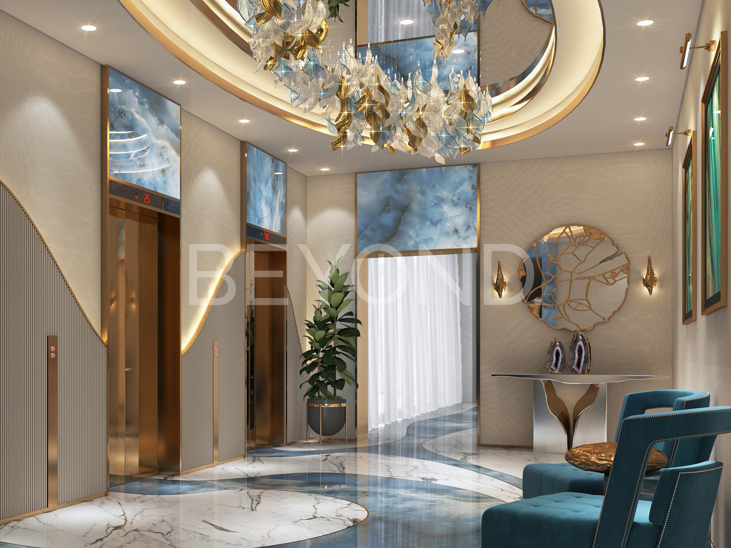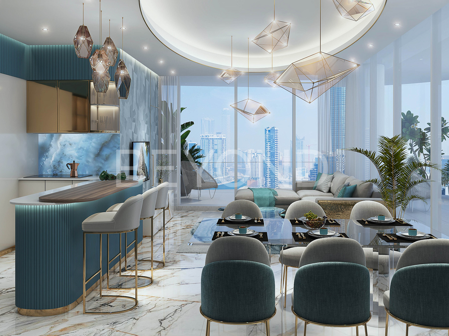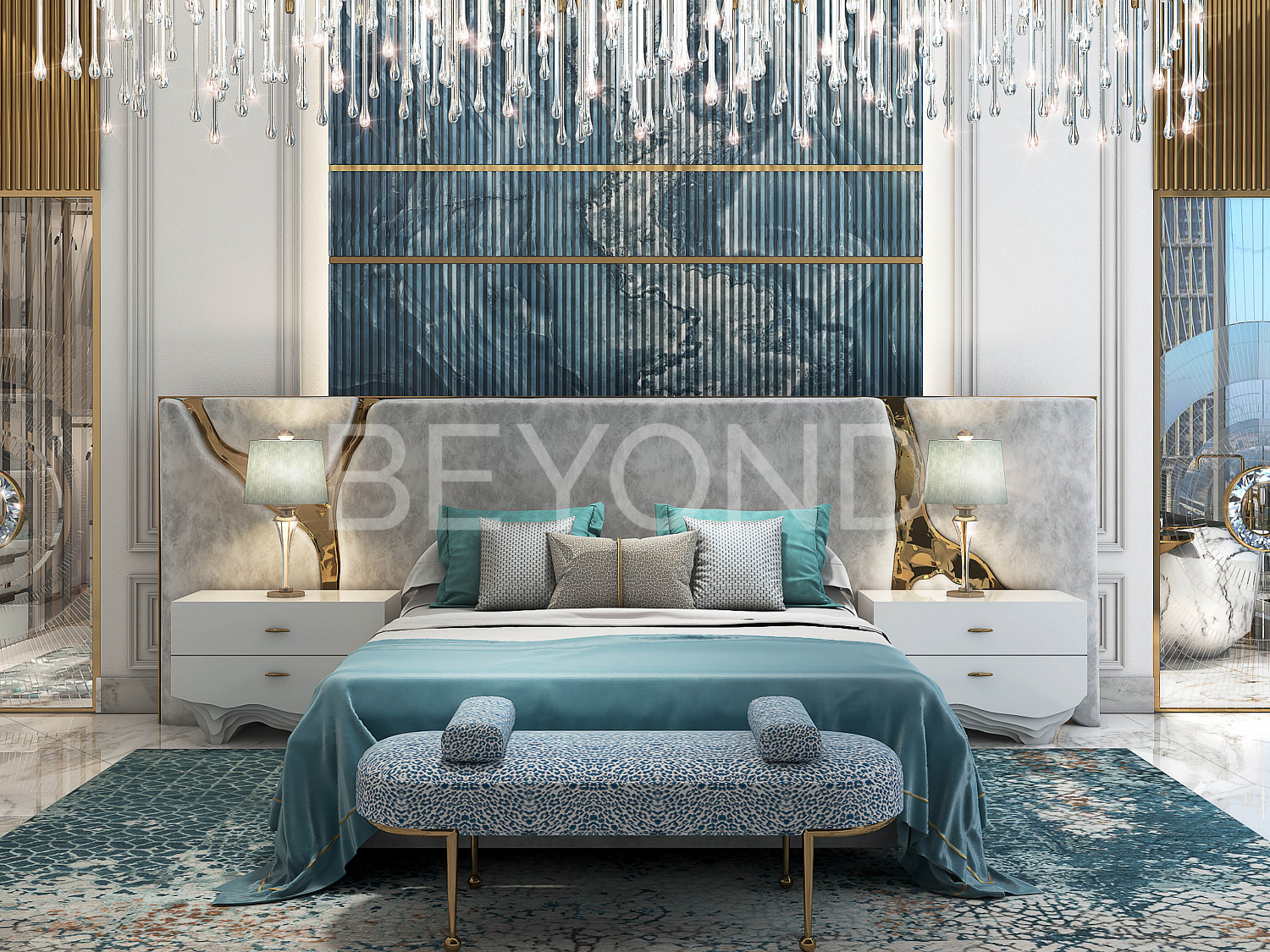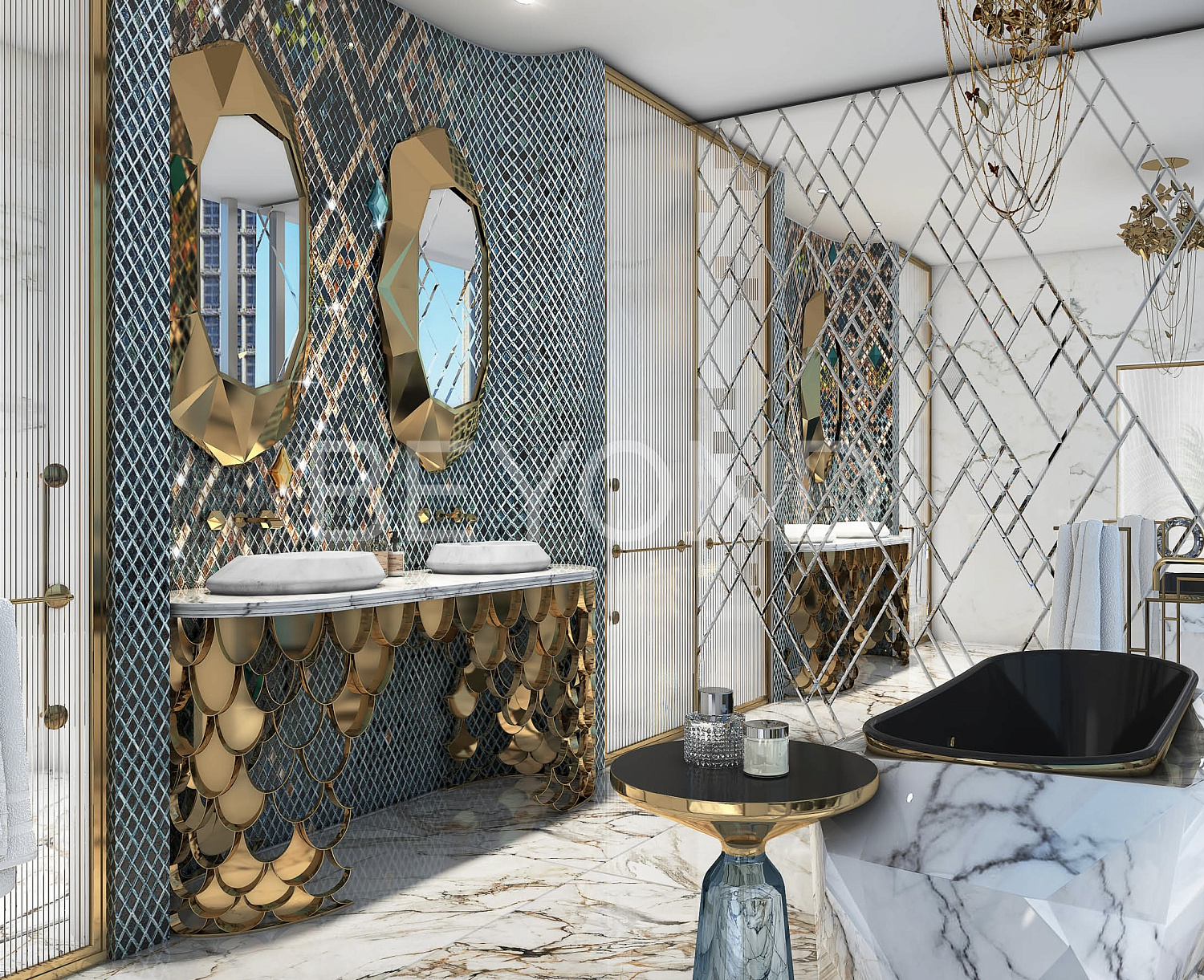Интерьеры апартаментов оформлены в изысканном стиле и разработаны специалистами известного модного дома Cavalli и всемирно известного бренда ювелирных изделий GRISOGONO. Для отделки использованы эксклюзивные аксессуары от этих брендов, премиальная мебель и ультрапремиальные материалы, такие как натуральный камень, бронза, латунь и дерево ценных пород.