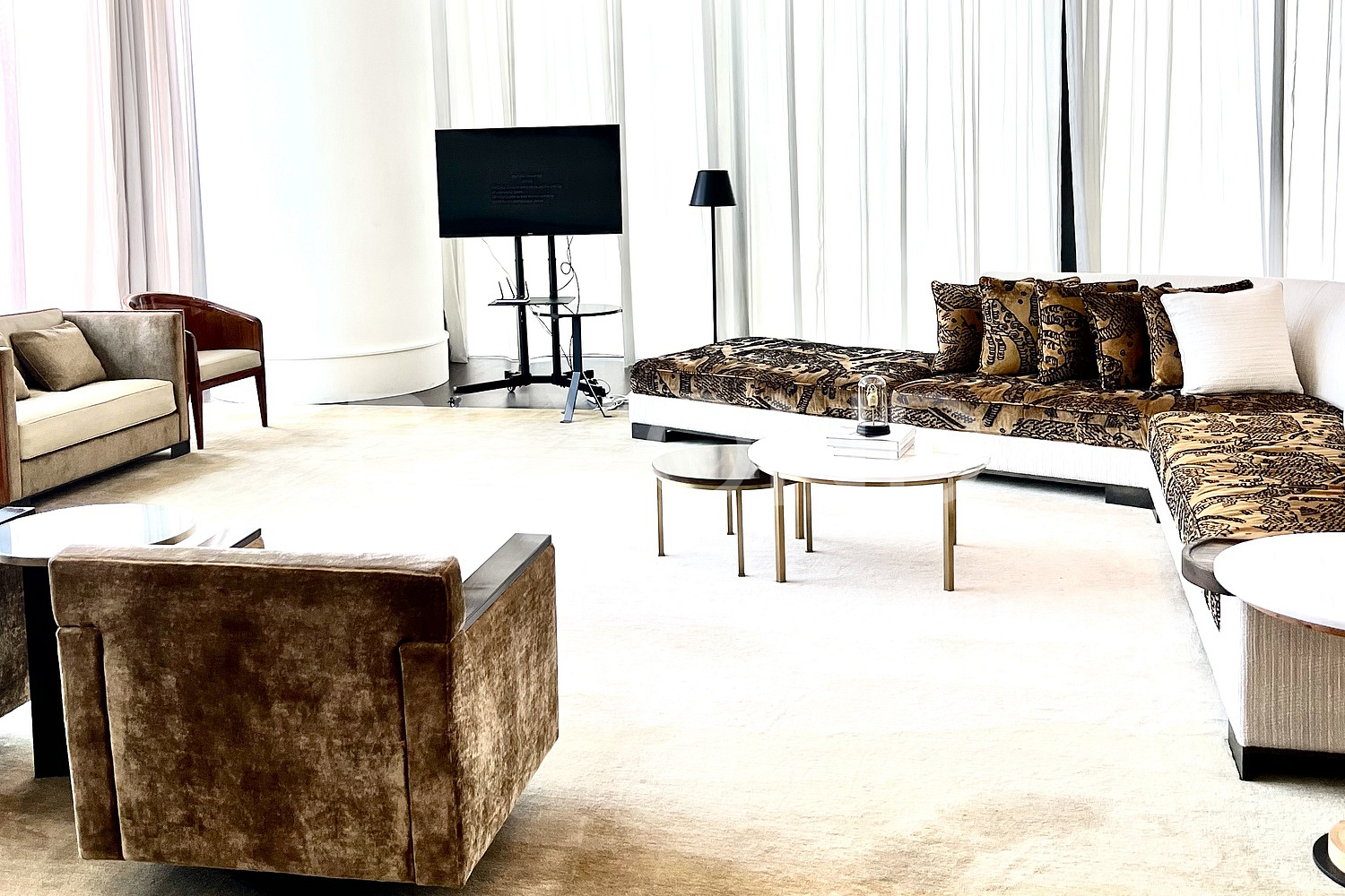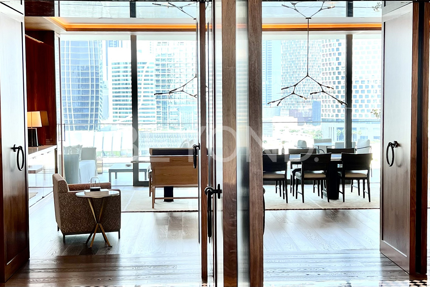 Предлагается к продаже полностью меблированный апартамент с тремя спальнями площадью 420 кв. м (4 500 кв. фут), расположенный на 5 этаже с панорамными окнами с видом на Burj Khalifa. Планировка апартамента включает в себя зону для персонала, кухню для повара, прачечную. Все спальни и кухня-гостиная имеют панорамные окна. Высокие потолки в апартаменте создают ощущение простора и величия. Особенность — собственный лифт.