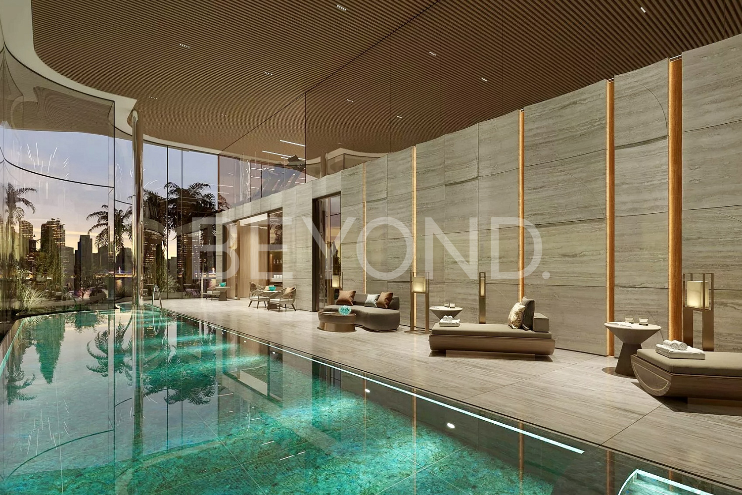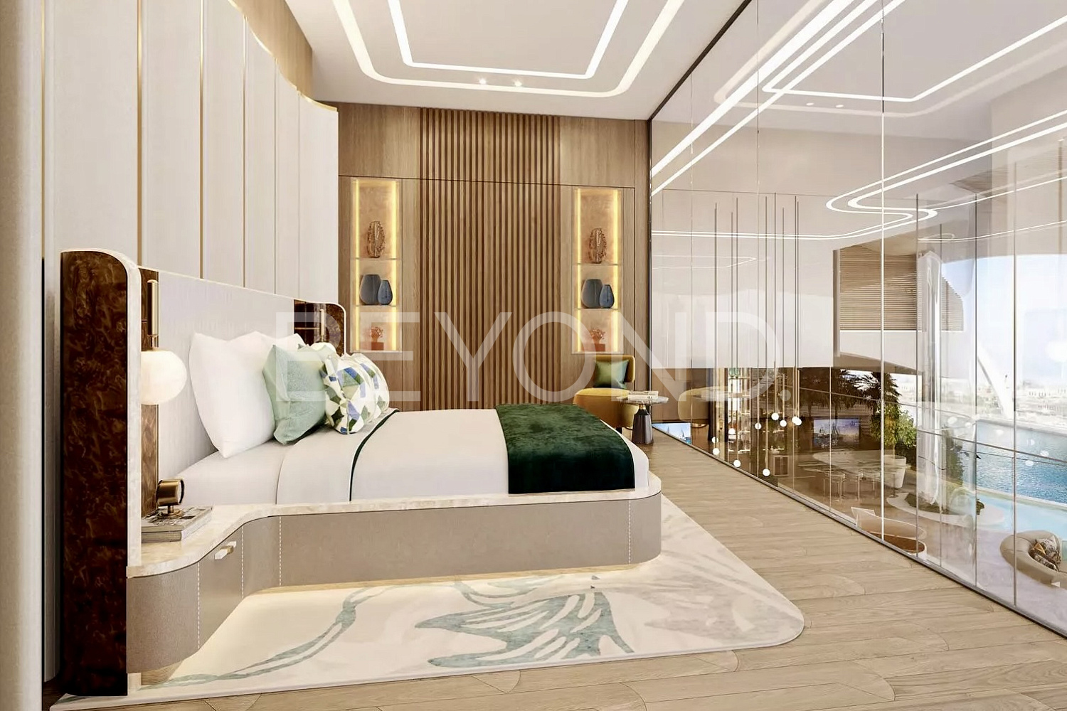 Ключевые характеристики апартамента включают: панорамные окна от пола до потолка, высокие потолки высотой 4,5 метра, три спальни с ванными комнатами, комнату для персонала, частный бассейн с регулировкой температуры, кухню и интерьер бренда Fendi Casa, дизайн выполнен Hirsch Bedner Associates. В дополнение ко всему престижное расположение у воды и вблизи парка.