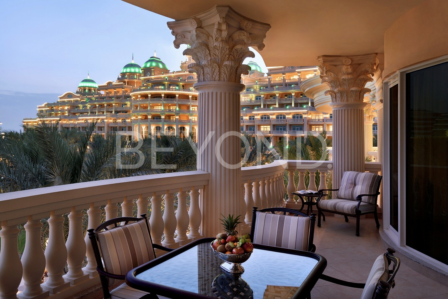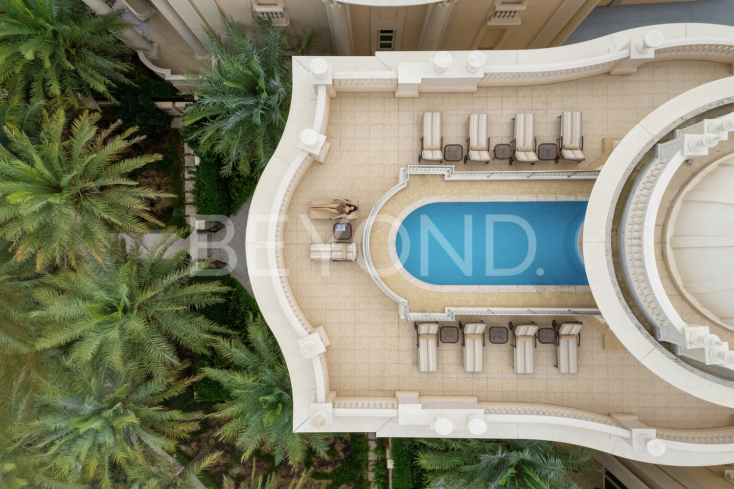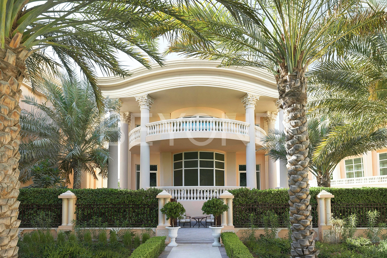 Вилла расположена на территории пятизвездочного отеля Raffles the palm Dubai hotel в непосредственной близости от пляжа. Участок усеян пальмами, по периметру — живая изгородь. Обилие зелени завершает оформление виллы, в которой хочется жить.