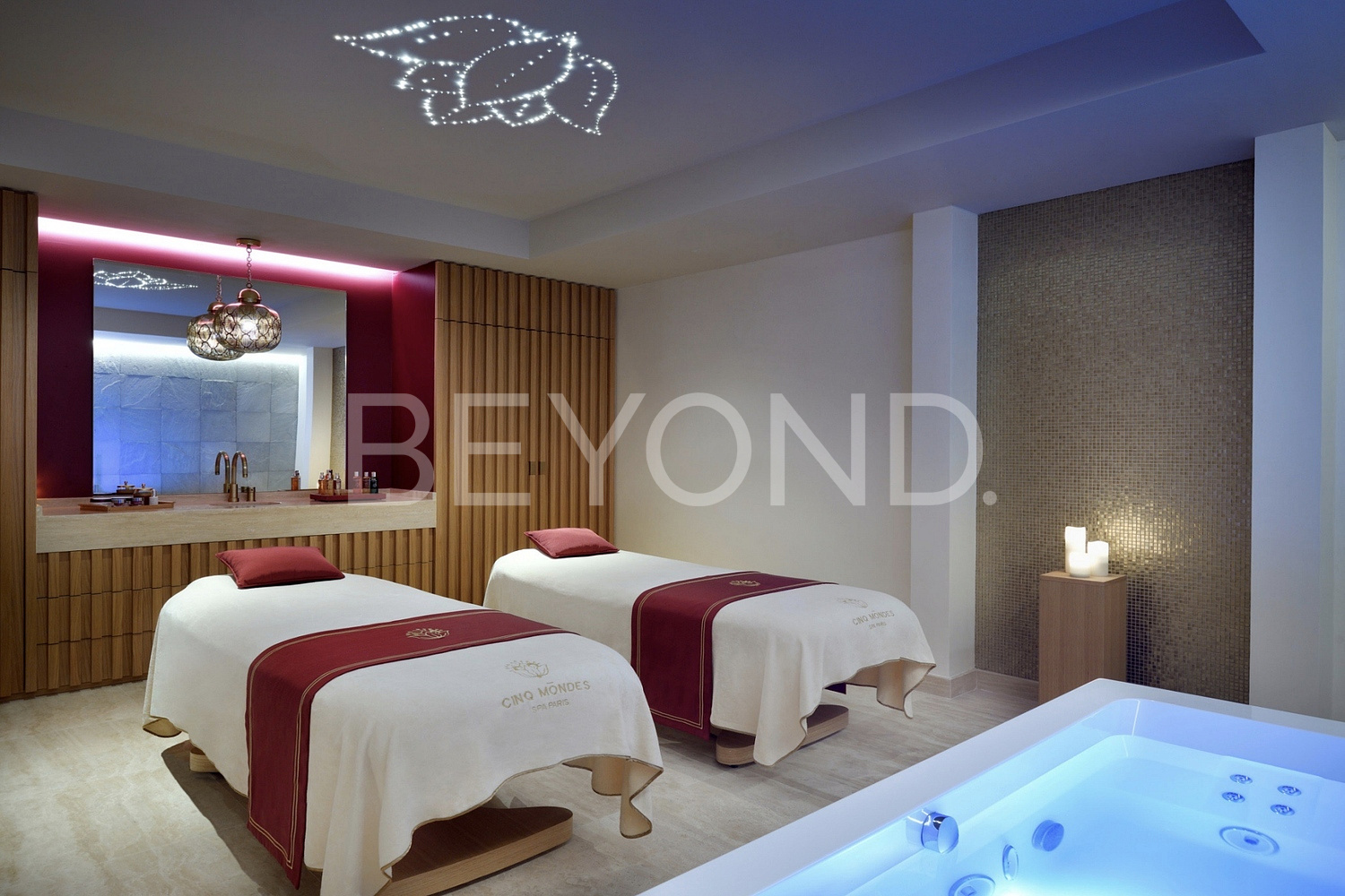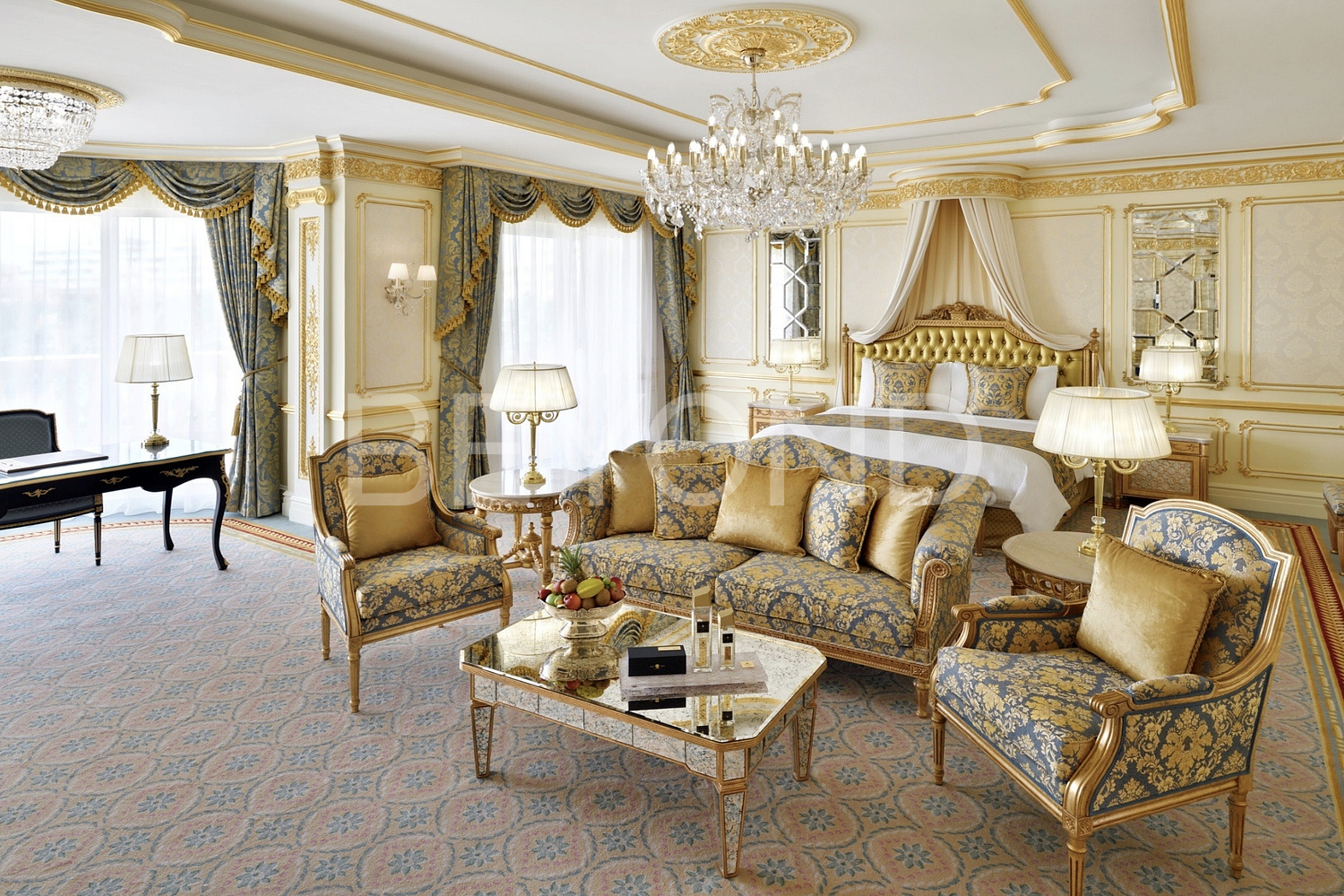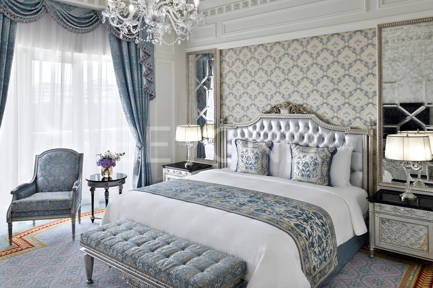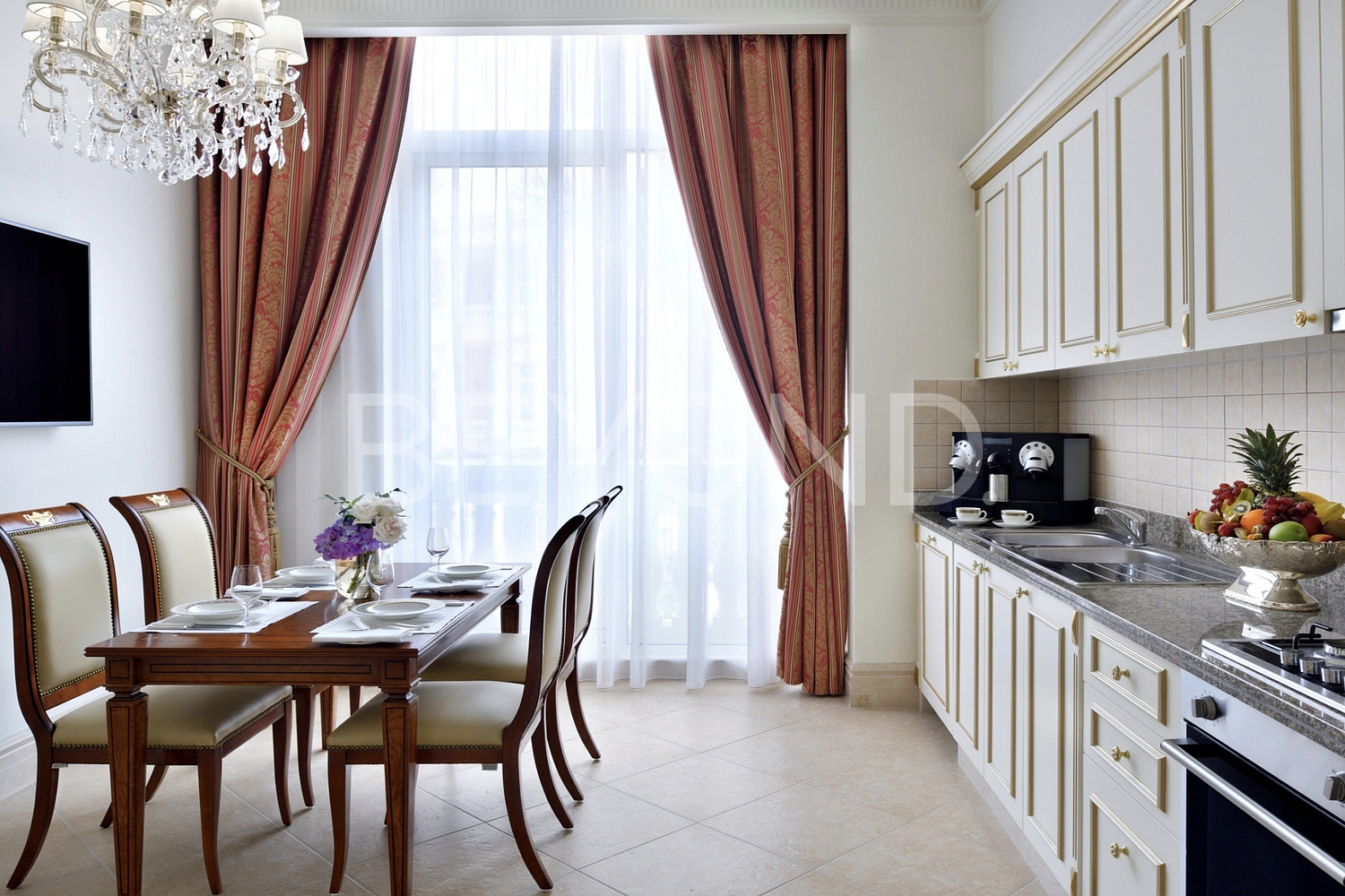 с кристаллами Сваровски, посуда Villeroy Boch, шторы Loris Zanca, Ольстерские ковры, столовые приборы Sambonet, мрамор Rosa Portogallo, настенная ткань Sangiorgio, сантехника Villeroy Boch.