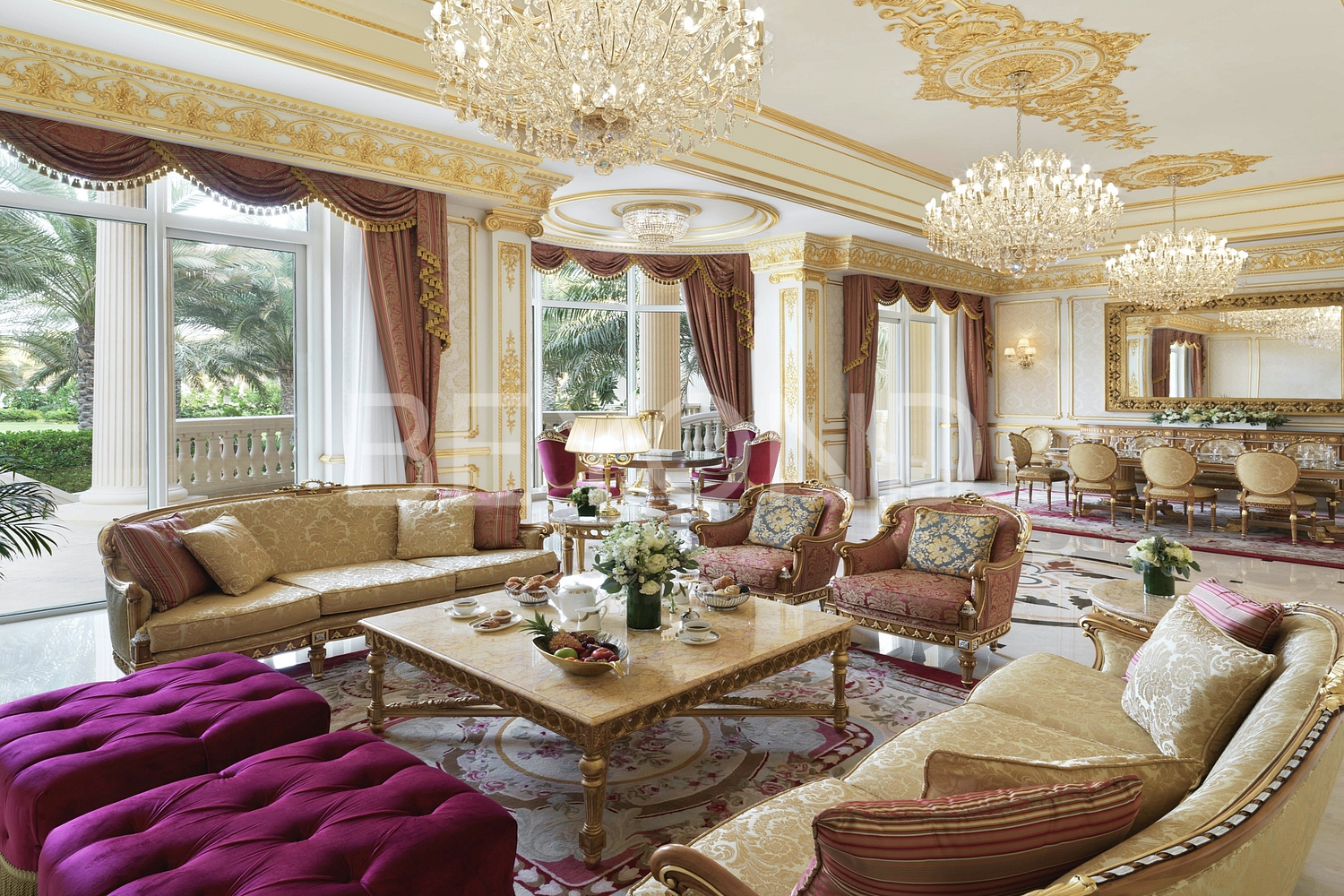 Просторная гостиная, совмещенная с зоной столовой, сияет золотом изысканной лепнины потолка и стен. Панорамные окна наполняют пространство светом и воздухом, а хрустальные люстры, переливаясь в лучах солнечного света, довершают картину роскоши и царственного великолепия.
