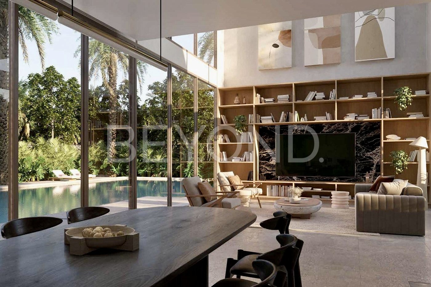 Стильные интерьеры дополняются панорамными окнами, из которых открываются великолепный вид на тропическую зелень, лагуну и цветущие сады.